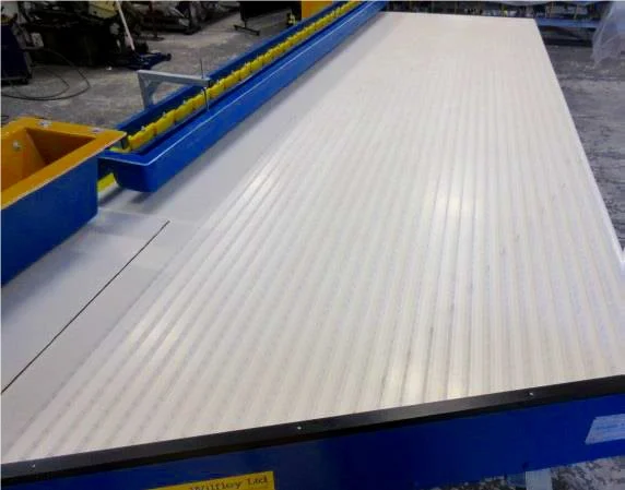 Deck supported on forty-two yellow polymer carriers and vibrated diagonally along the entire length.